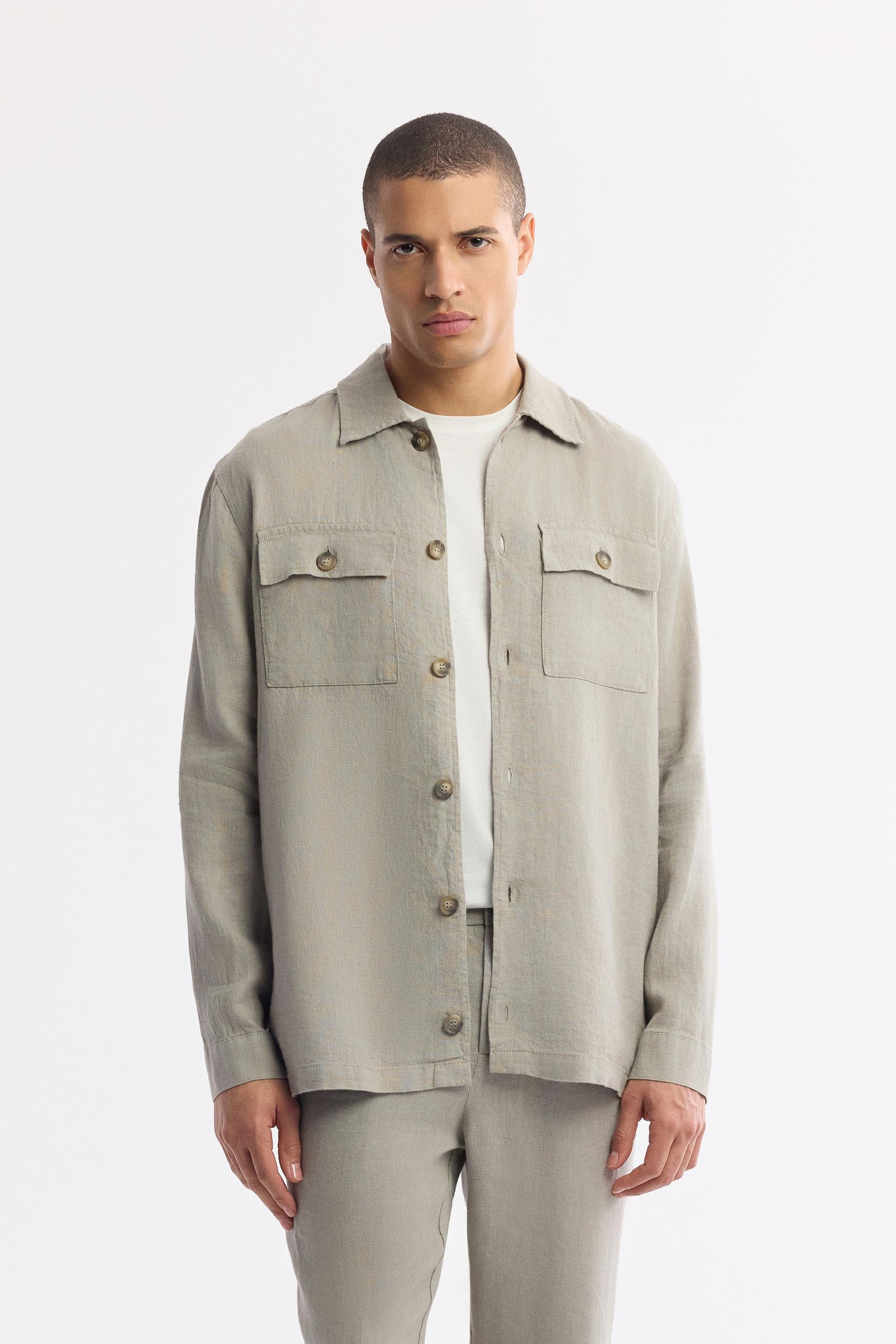 Klasik yaka, Önü düğmeli, %100 Keten, Nefes alır, Serin tutar, Göğüste düğmeli cep detaylı, Etek ucunda deri branding detaylı, Comfort Fit Gömlek Ceket