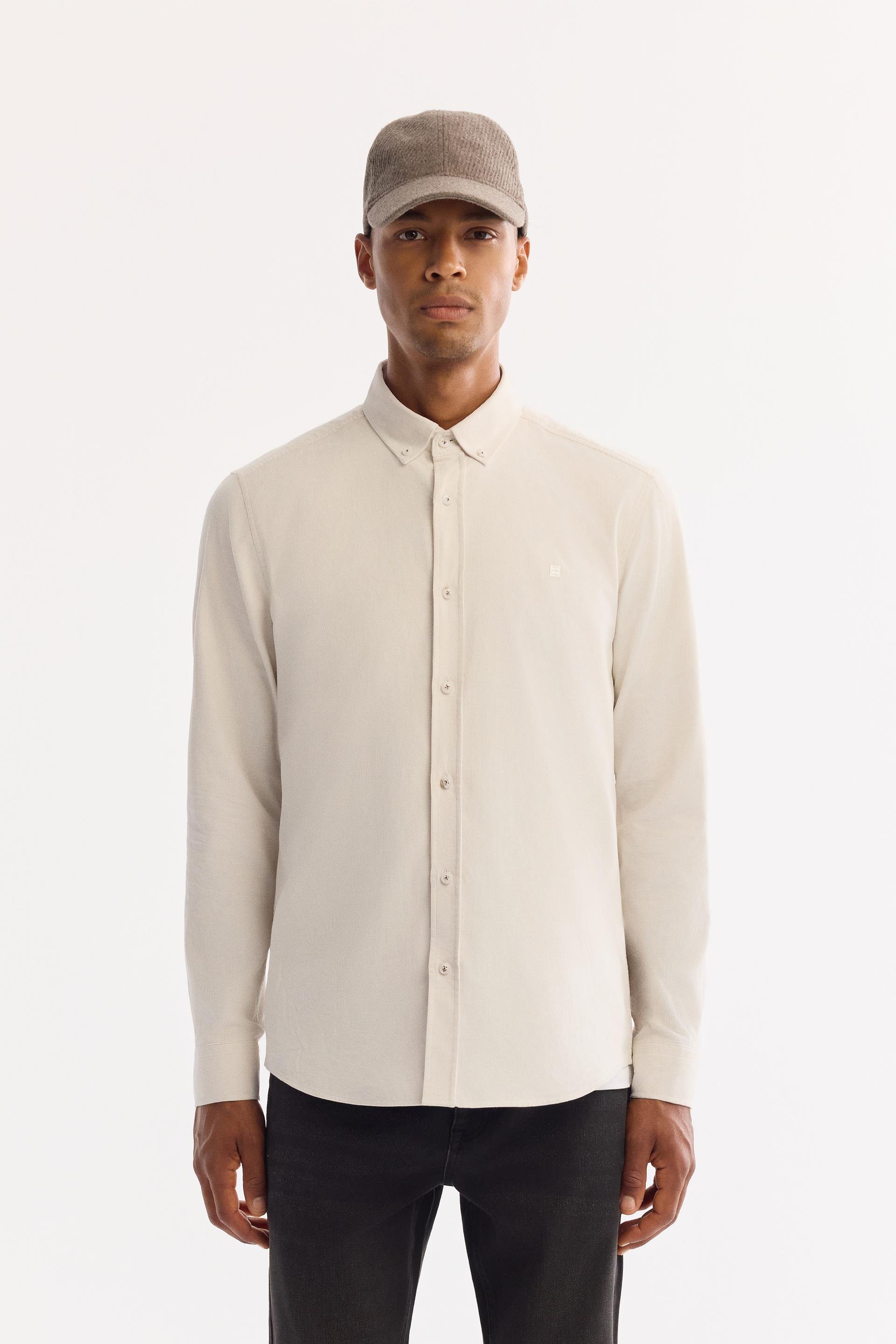 Kırık Beyaz Düğmeli Yaka Fitilli Kadife Pamuklu Regular Fit Gömlek