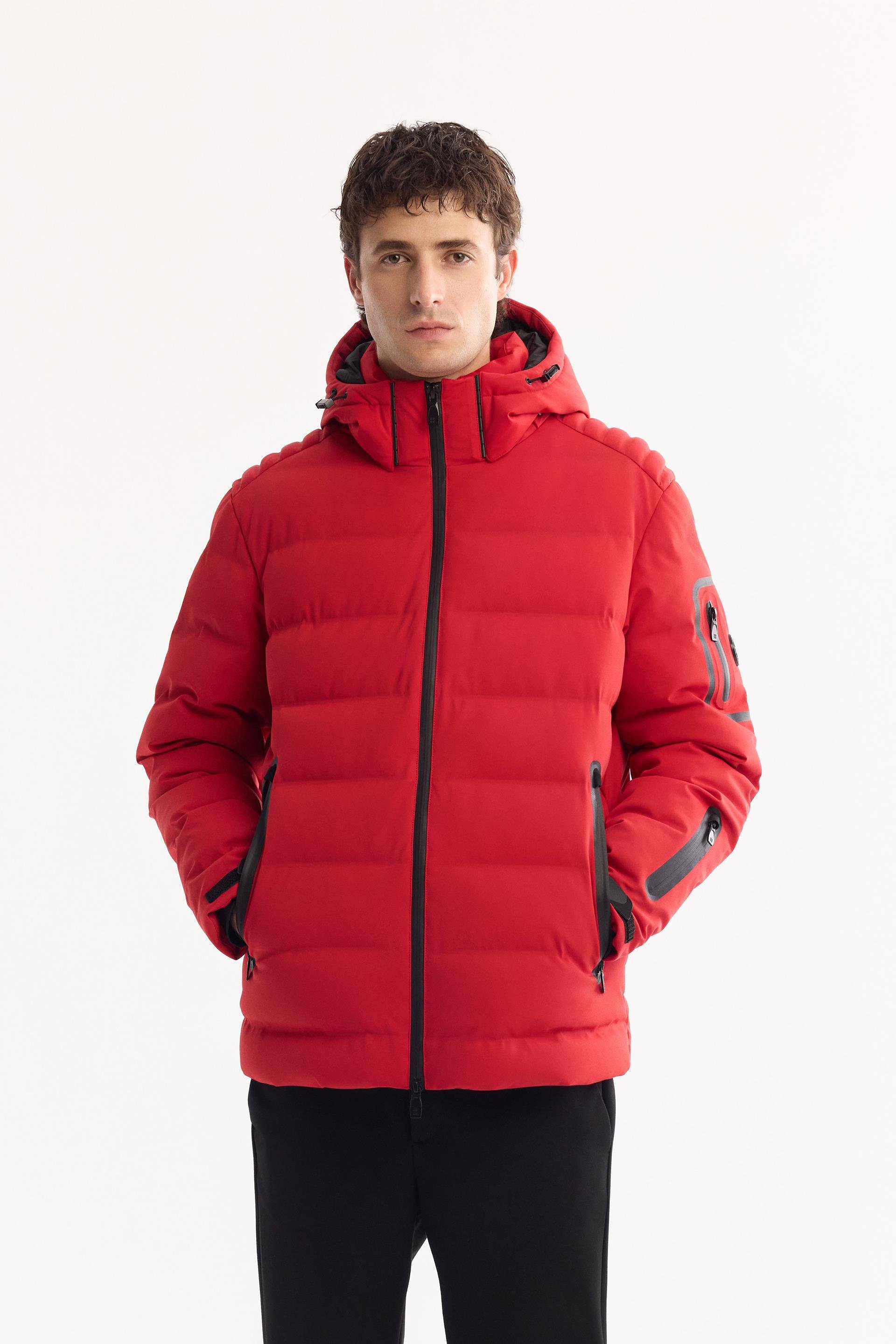 Çıkarılabilir ve ayarlanabilir stoperli kapüşonlu yaka, Su itici, Rüzgar geçirmez kumaş, Sıcak tutar, Kollardaki elastik içten çıkan manşetler ek termal koruma sağlar, Kollarda cırtcırtlı ayarlanabilen kollar, İçte termometre göstergeli, Önden fermuarlı kapama, Kolda fermuar ve branding detaylı, Yandan cepli, Comfort Fit Şişme Mont