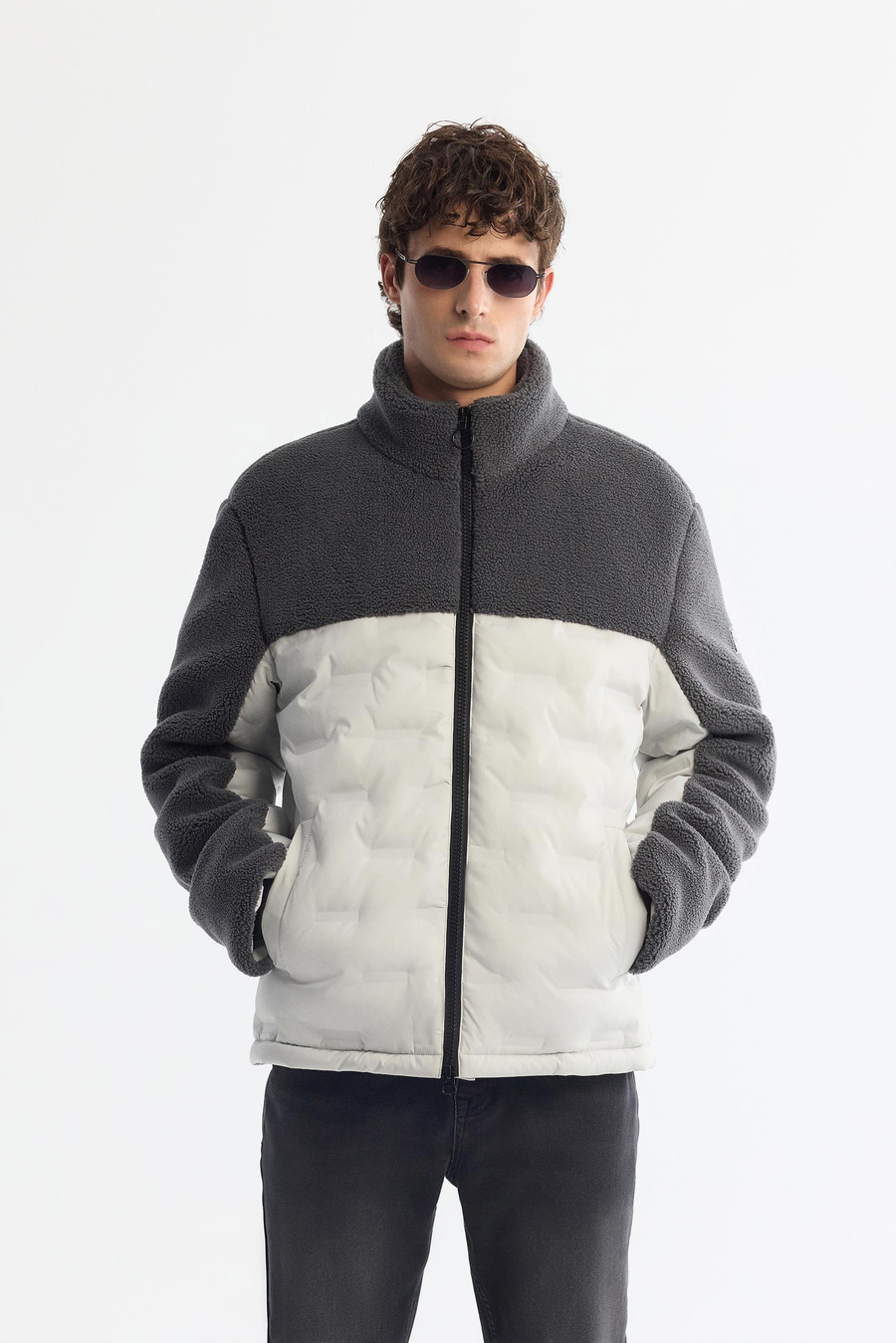 Gri Dik Yaka Su İtici Rüzgar Geçirmez Elyaf Şişme Peluş Mont (A42Y6017-20)