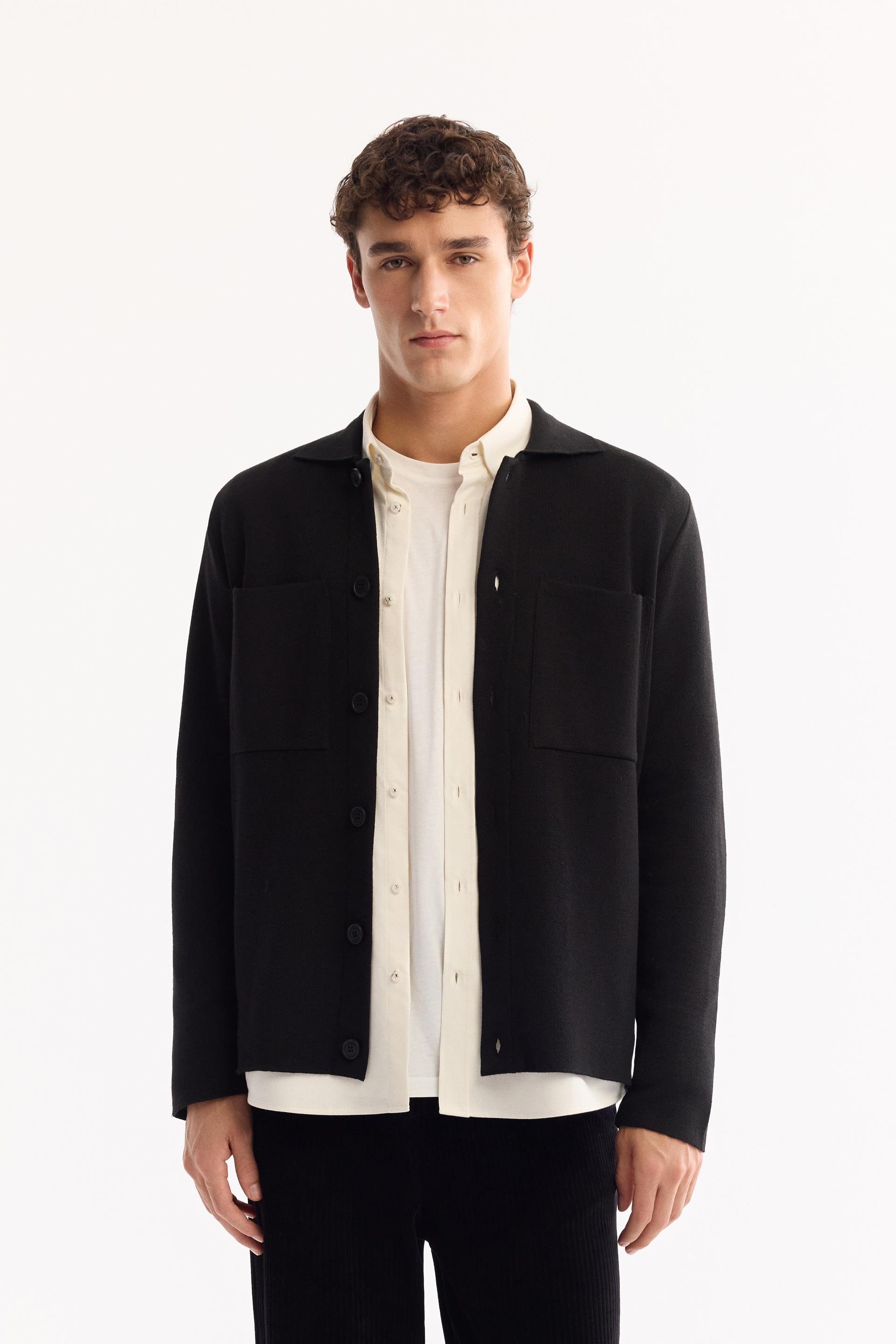 Siyah Polo Yaka Düğme Kapama Önü Cepli Yün Hırka