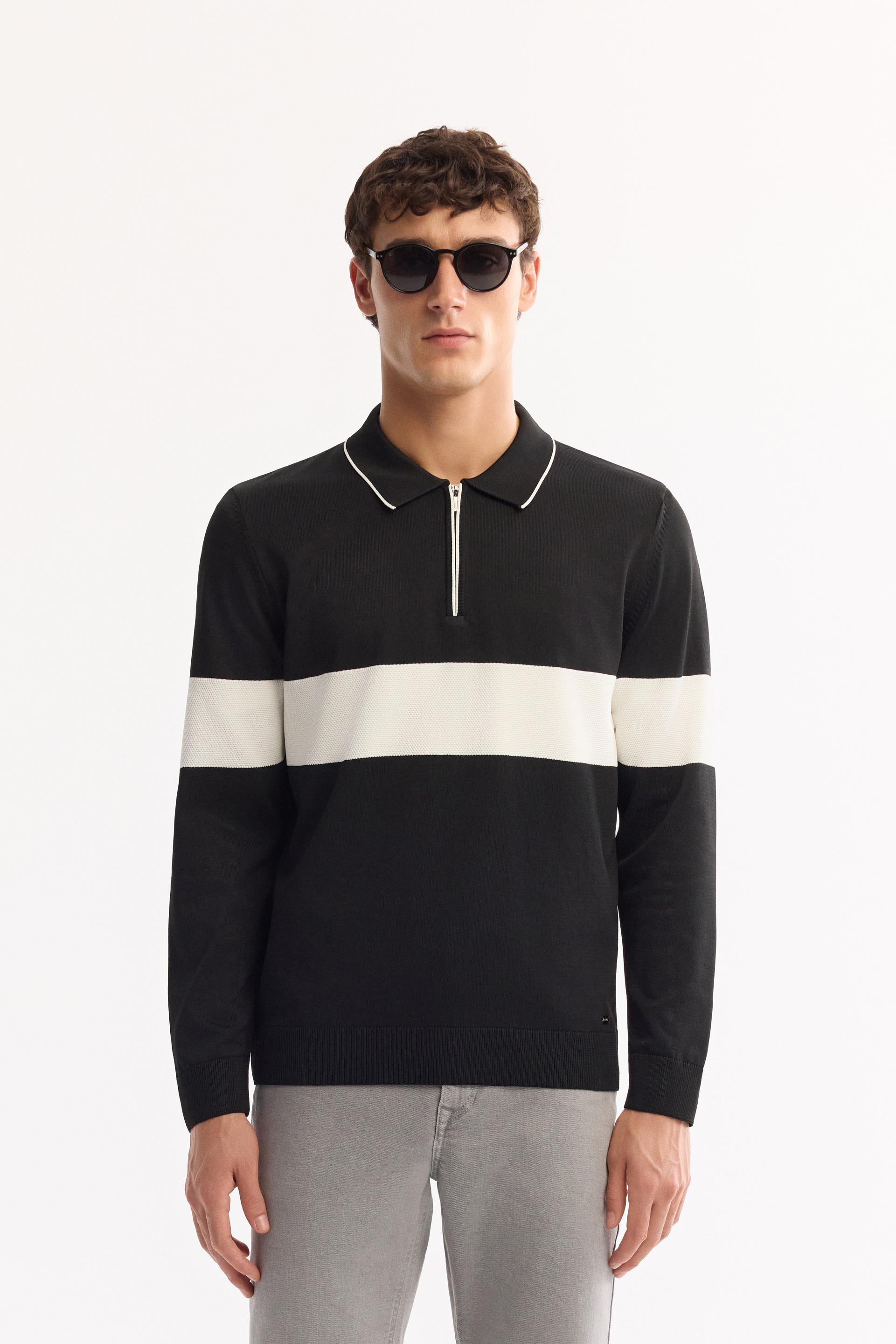 Siyah Polo Yaka Fermuarlı Çizgili Triko Kazak (A52Y5090-03)