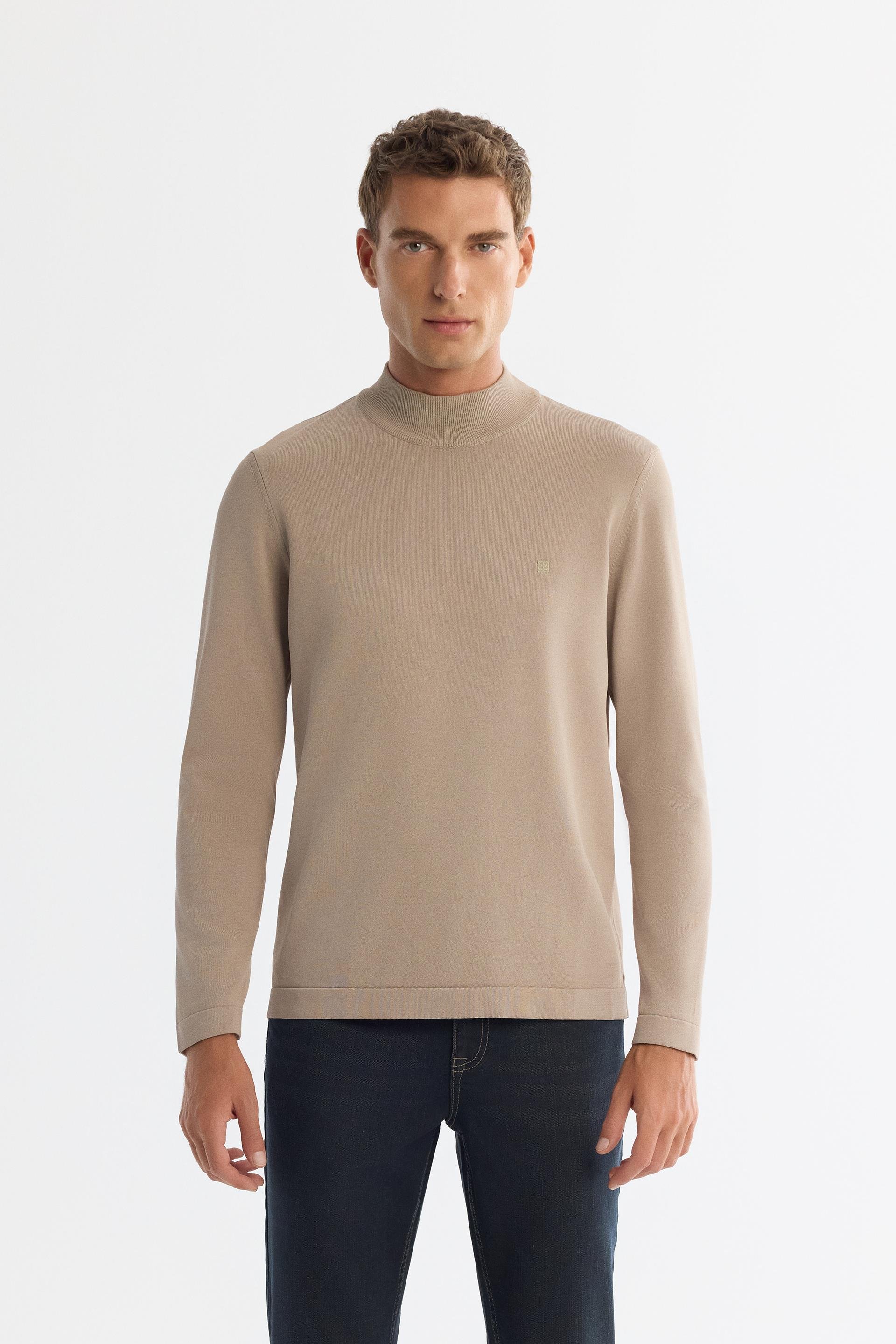 Yarım balıkçı yaka, Doğal parlaklığa sahip Rayon kumaş, Tüylenmez, Uzun kollu, Yakası rib örgülü, Kolları ve etek ucu kendi kumaşından, Göğüste nakış branding detaylı, Regular Fit Triko Kazak